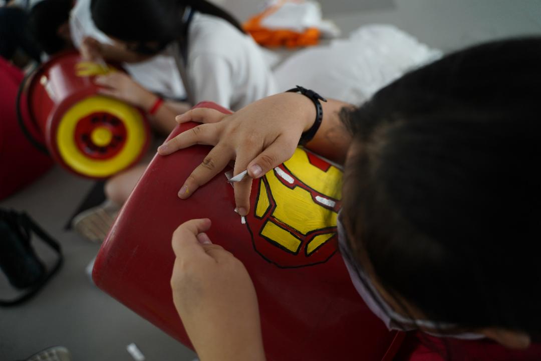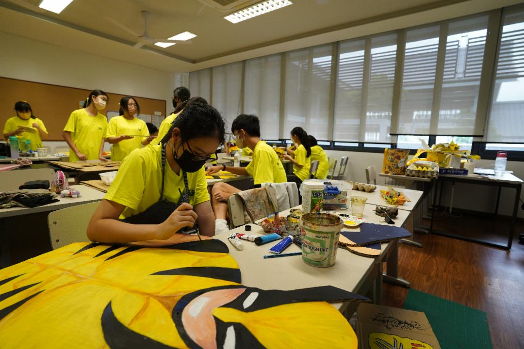 设计组不同于参加运动项目的学生,在草场运动场挥洒汗水,也不像啦啦队或步操队不断地重复排练。来自中学部各年级的同学们,埋头在剪剪贴贴,画画涂涂,甚至连啦啦队出场用的小草绳、面具、举牌等小物件的用品都做得很细致,加上不间断地与老师和同学讨论与尝试手作。他们忙于手上该做的任务,紧锣密鼓展开筹备工作,是幕后默默耕耘却不可或缺的一组。