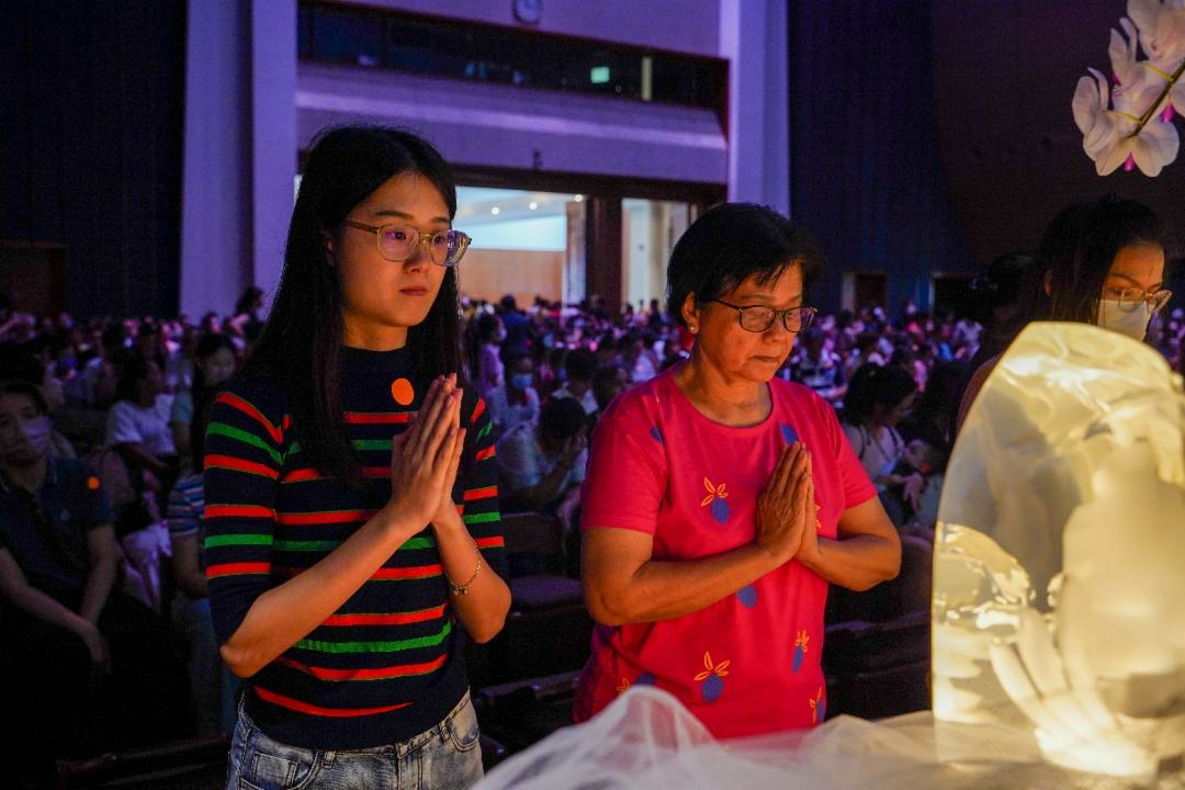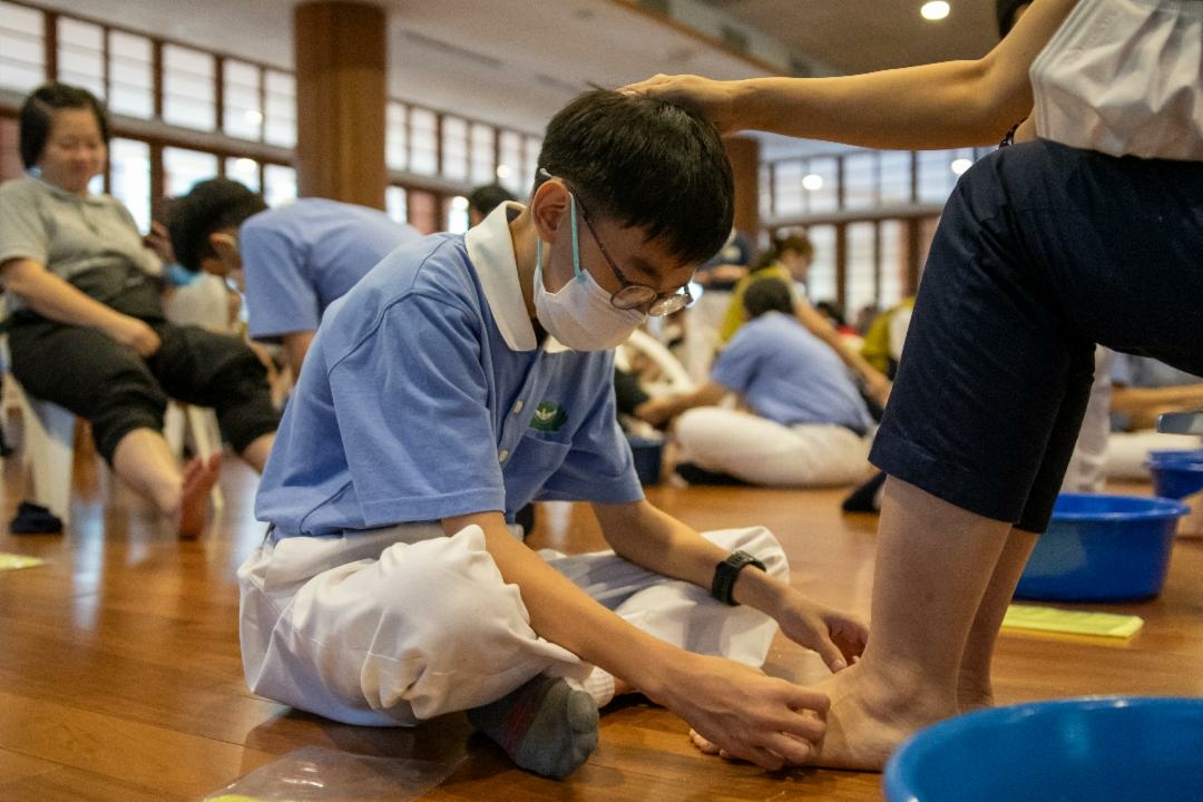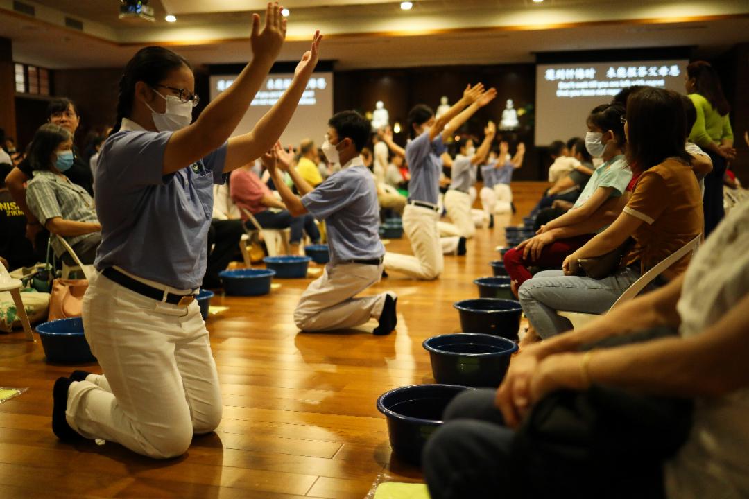 早上九时,第一场浴足的环节掀开了当天浴佛庆祝的序幕。会众们扶老携幼地踏入感恩堂,父母或长辈坐在小白椅上,孩子们各站在身旁。主持人用温柔的声音缓缓地述说起父母如何一手养育孩子的点点滴滴。