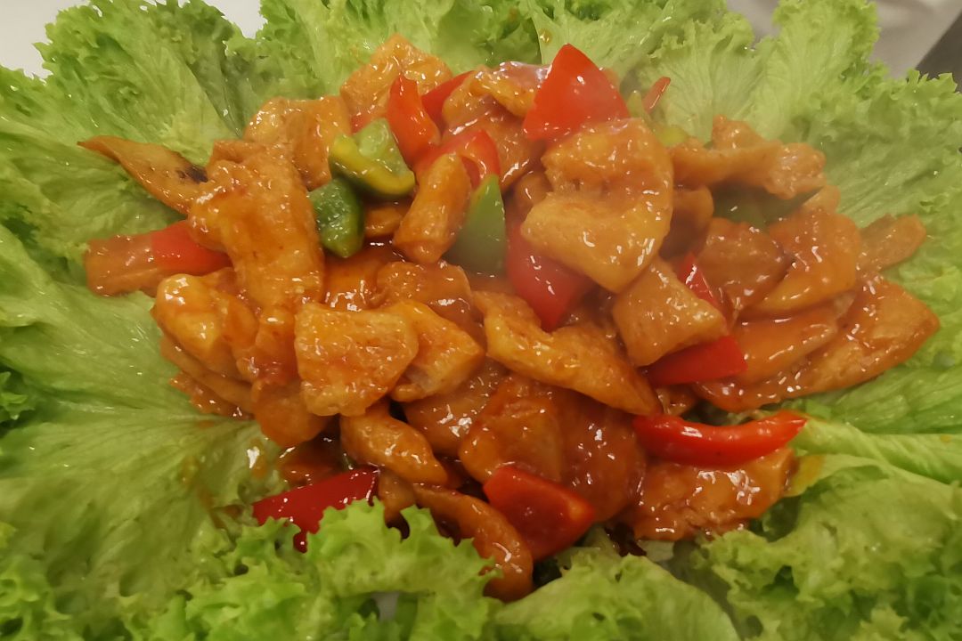 素锅包肉采用植物蛋白制品烹调,酸甜口感,令人食指大动。【摄影:杨秀丽】
