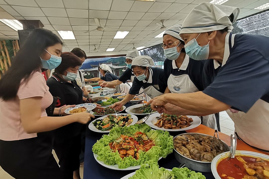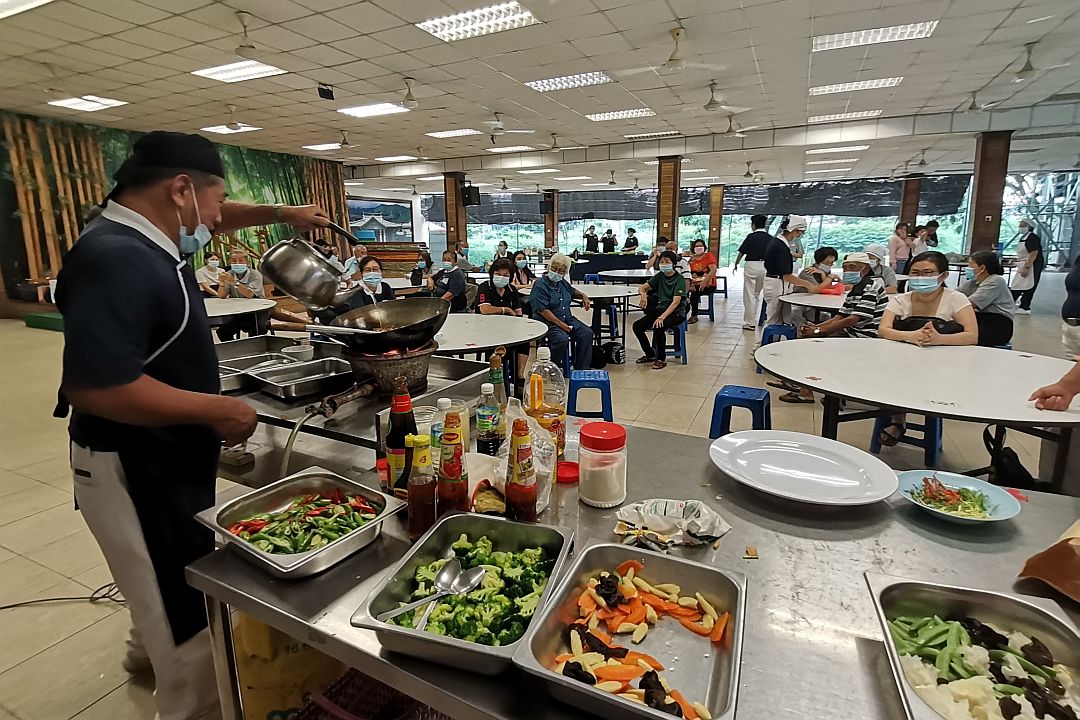 2021年4月11日下午四点半,慈济马六甲分会的斋堂热闹滚滚。志工甘浩祯(济帛)正在忙着准备当晚的社区联谊和素食烹饪的食材,有他拿手的咖喱猴头菇,现场热炒杂菜、红烧豆腐、清炒芫菜。长桌上摆满了其他志工的家常小菜、炒饭、糕点、糖水……