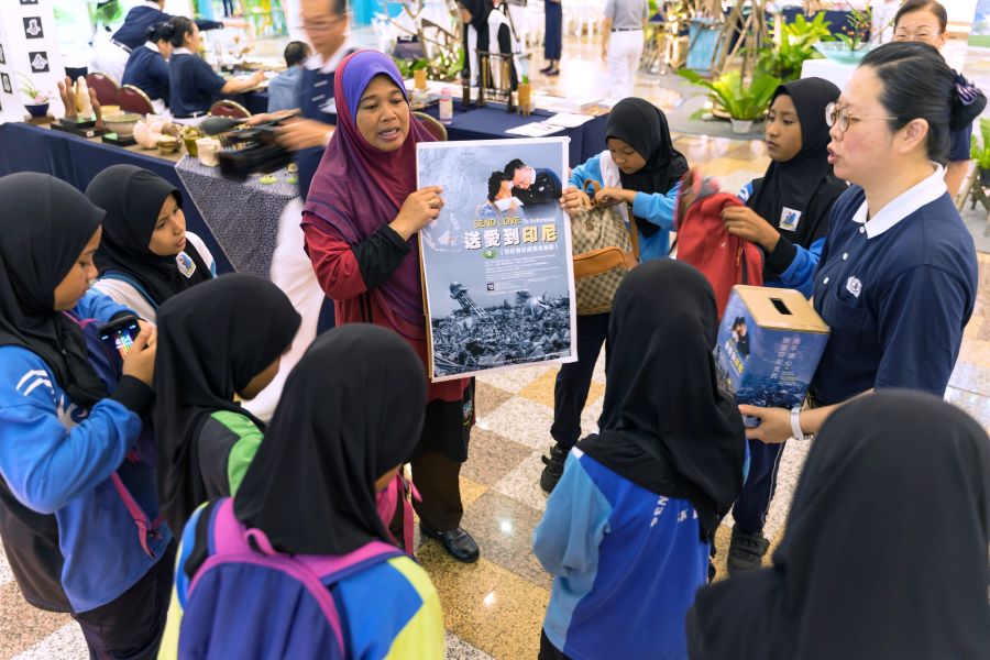 玛哈佑看见志工在现场为印尼灾民募款,她遂引领学生们一起付出点滴爱心。同学们将钱投进爱心箱,也祝福印尼人民平平安安!