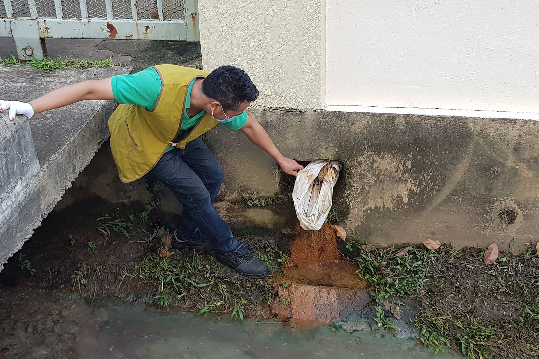 志工们弯腰做环保,有的还走下沟渠,企图将塞住的垃圾拉出来。志工也把严重堵塞的水沟拍照记录,准备向有关当局请求协助。