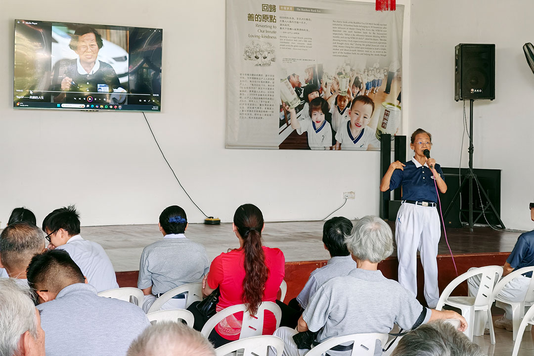 接下来播放了芙蓉慈济环保志工影片回顾。画面中记录了过去一年里,志工们在各个环保点的身影:有人在烈日下捡拾废弃物,有人耐心分类回收物,还有志工带领社区小朋友认识环保知识,每一个镜头都展现了默默付出与无私奉献的菩萨精神。