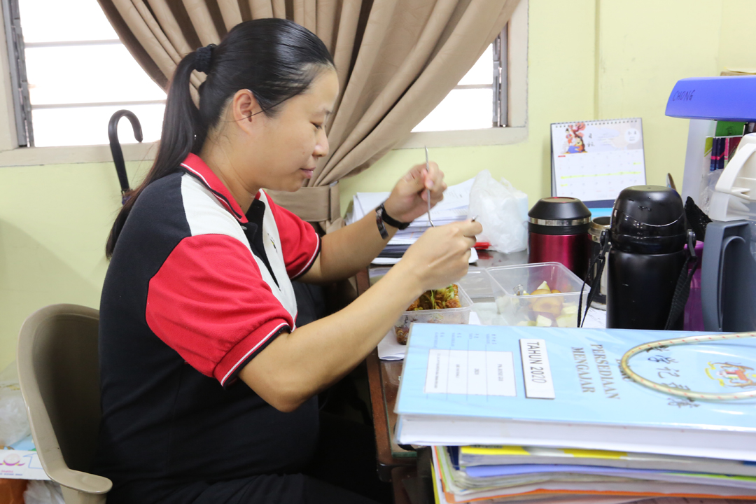 从槟城转来此校服务,茹素的她往往只能自备午餐,偶尔去食堂购买,但每次都要询问服务人员哪道菜有放荤食?现在食堂总会煮几道蔬食,或是特别提供素炒饭,素炒面,让他们一家人午餐得以方便解决。