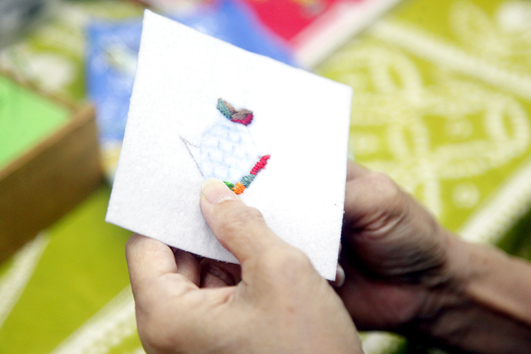运用剩余线材,一针一线缝制图案,让人可以在专注中沉淀心念,带来疗愈感受。【摄影:黄玉花】
