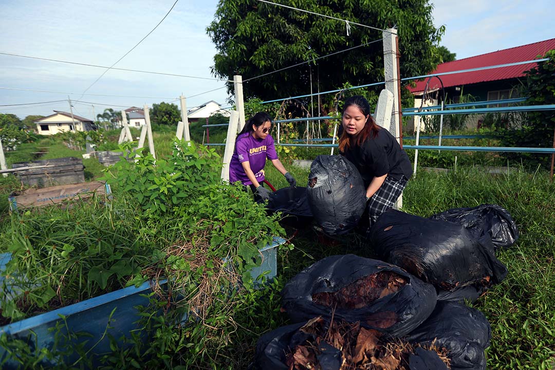 女众志工同样不让须眉,一人一辆单轮手推车,一袋袋沉甸甸的树叶运往各个堆肥区。过程既累又吃力,有人来回两三趟便喊着“我没力气、推不动了”,也有人无法平衡车子的重量而翻车。她们看着彼此出糗的模样哈哈大笑,稍作休息后,又重新站起来继续劳作,没有人轻言放弃。