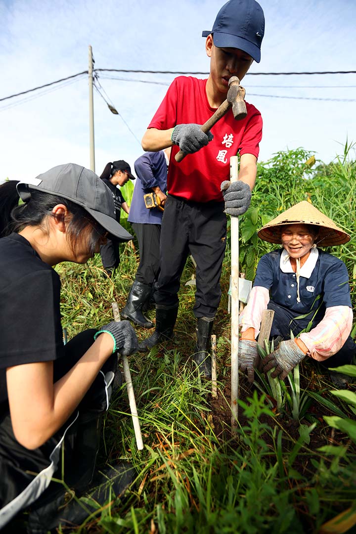 二十五位参与者之中,有熟面孔的常客、久违再来的身影,也有首次报到的年轻人。大家分工合作,有力气的男众志工背起割草机开始除草,或扛着一大捆铁线,来到瓜棚区协助搭建爬藤架,为攀藤作物打造合适的生长空间,也塑造绿意盎然的农场景观。