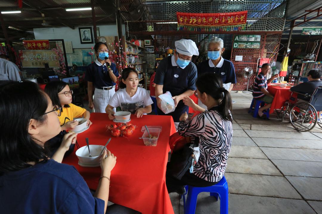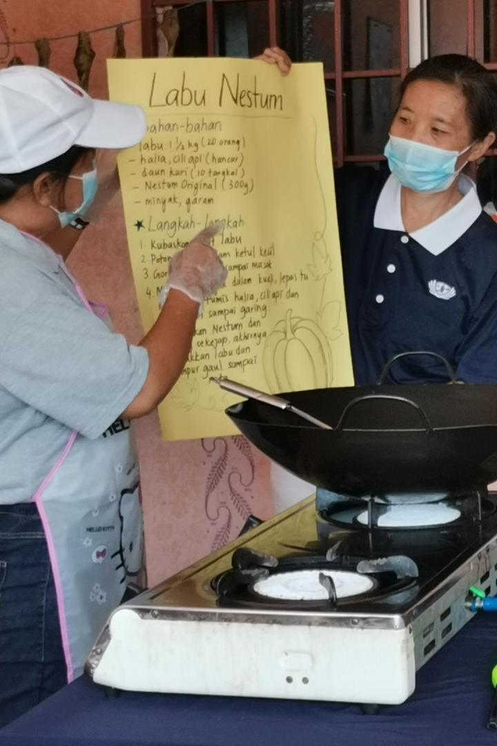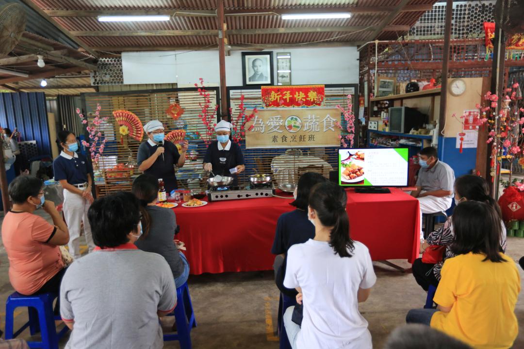 2021年,马六甲慈济志工一改过去的口头鼓励,采用小型居家爱洒方式,召集数家住在邻近的照顾户,在户外小小车房空间,或到环保站,用烹饪示范方式,让照顾户明确了解,“素食简单煮,食材唾手得,可多做变化。”