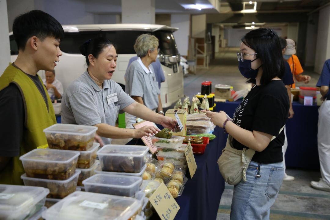 九点半,义卖正式启动;十一档素食摊位与一档园艺摊位同步开张,百余道素食如椰香粟米奶冻、菊花柠檬水、炒义大利面等纷纷亮相,让社区家人以行动护生、以美味传递善念、以购买支持环保。