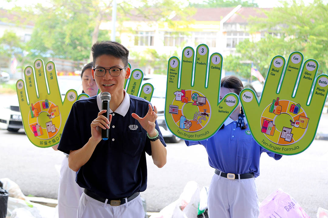 志工郑维丰分享“环保十指口诀:瓶瓶罐罐纸电1357”,简单的口令分别代表着不同种类可回收的物品,帮助人人正确进行分类。【摄影:廖志勇】