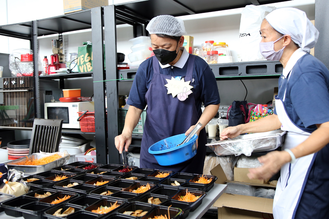 志工陈宝凤(虑暐)承担此次蔬食义卖活动,背后是她推素的心念。她说:“上人一直推素,简单素食不吸引,因此她选择较有特色的香饭粒、汉堡等,宁愿多花一点时间手工制作,比买现成的素排、酱料等更能吃到蔬食的美味与营养。”她费心用杏鲍菇和豆类制作一百二十多份素汉堡排。此外,还准备一百多份的当归白切机和素机腿,又腌制开胃菜阿渣(Acar),自制各种搭配餐食的酱料,与烹煮约二百五十份的雪耳糖水等,全靠她利用下班时间自行做事前的筹备工作。