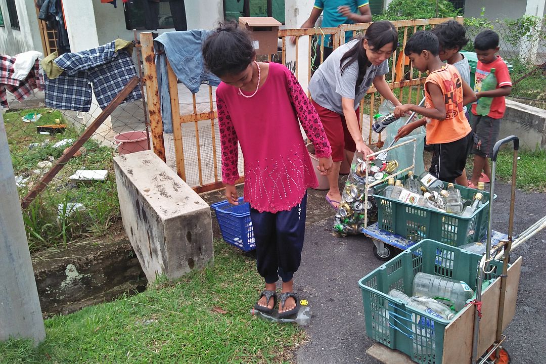 志工用特制的推车做环保,邻近的孩子们也跟着一起做资源回收。【摄影:刘嫒莲】