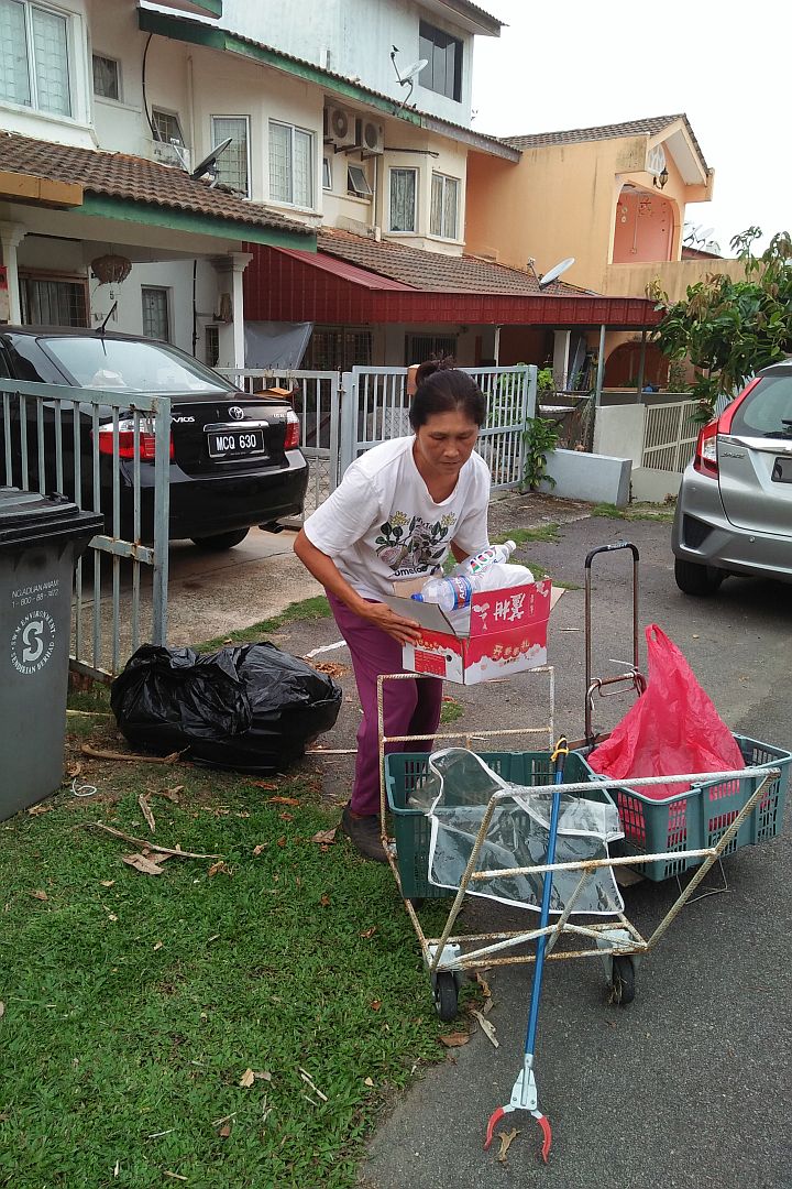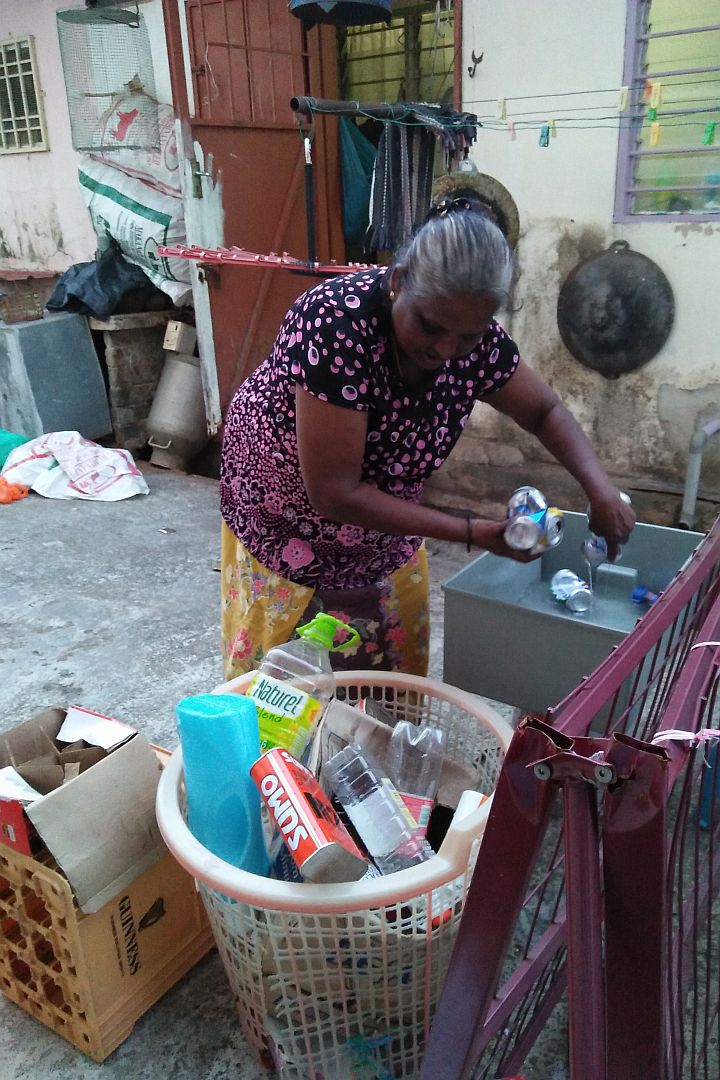 印裔民众珊妲(Santha A/P Pariana Muthu)闲来常坐在屋前纳凉,看到志工们做环保的身影,引起她的好奇心。满脸疑惑向志工询问:“你们是在捡垃圾吗?”