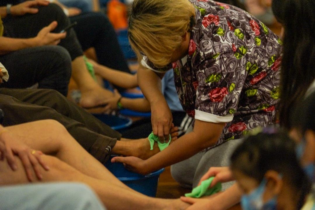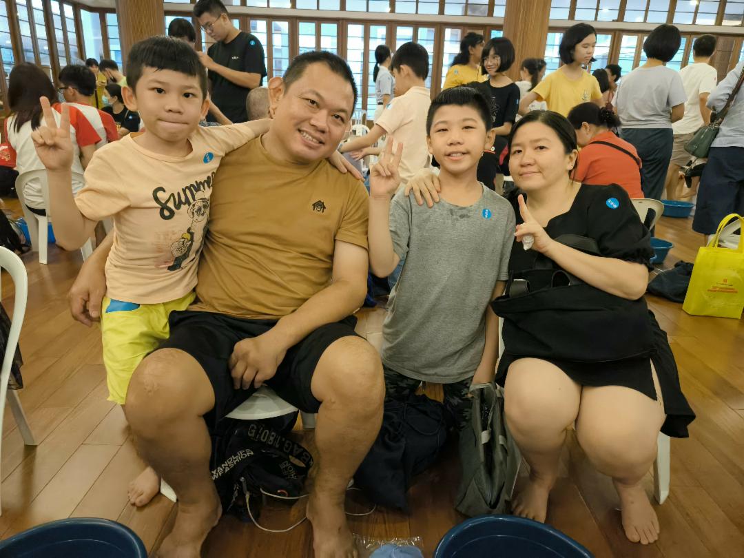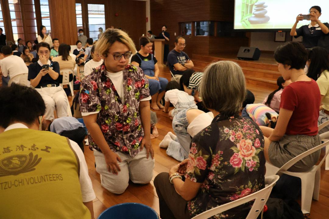 一对聋哑夫妇携带两个儿子出席活动。他们听不到〈跪羊图〉的歌曲,孩子在身旁比划手语,尝试让父母用眼睛“听”,场面令人感动。陪伴他们的三位志工也在一旁写字或比手语传递浴足的意义。