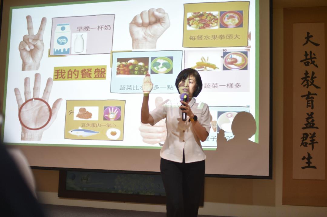 “我的餐盘口诀” —— 每天两杯奶,每餐水果拳头大、菜比水果多一点、饭跟蔬菜一样多,蛋白质食物一掌心,坚果种子一茶匙。这样复杂的概念,谢博士以“剪刀、石头、布”来比喻,加深会众对于选择健康食物的理解及实践,让讲座会增添一丝欢乐的氛围。