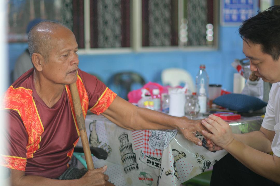 班迪(左)患有帕金森氏症及关节炎等健康问题,趁着义诊的机会,他第一次尝试针灸疗法,大赞效果良好,并表示接下来会请孩子载他到外寻找中医进行后续治疗。【摄影者:黄贤贤】