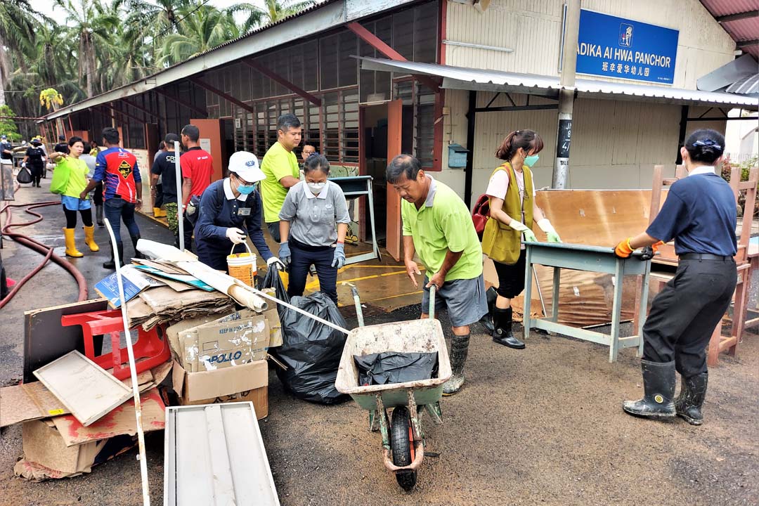 两天四个灾区——班卒、岭嘉、坤兰乌汝及玉射的水灾清扫行动,共动员六百一十五人,打扫六所学校、七十三间民宅及店屋。