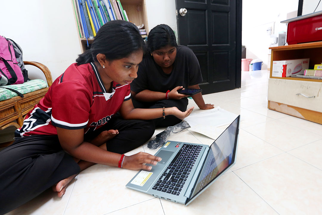 米杜娜请姐姐玛菈丝里(Malasri A/P Visvalingam)帮忙安装电脑基本软件,边说:“谢谢志工帮忙请购全新电脑。如果没有它,我可能会先向朋友借用电脑做作业,再想办法。”这是少女面对未来的勇气。