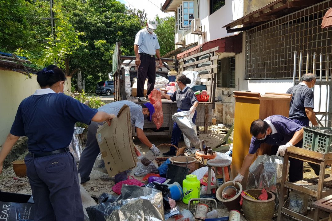 第一天打扫,志工顶着疲累的身子,经历五个半小时,终于把车房和客厅杂物清空。邻居告知,厨房和后方有更严重令人作呕的味道和物品囤积,担心出现变卦。第二天,志工吴雅莲(慈瑔)再号召一批男众志工,带来两把水枪助力,彻底清洗、去除顽固污泥,再经历数小时,终于把楼下里里外外清扫干净,异味也消除。