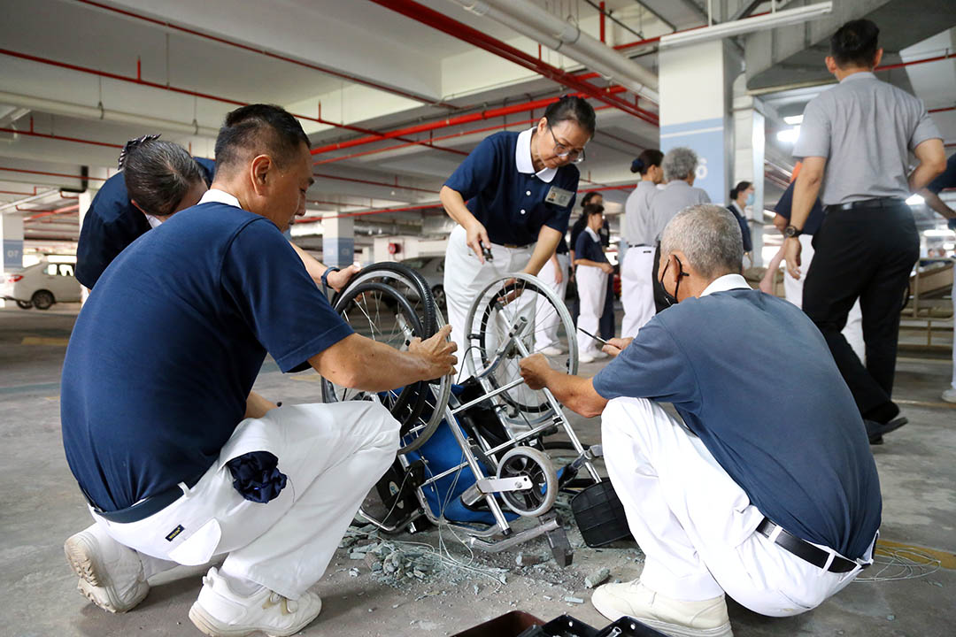 志工郑成华表示,许多辅具回收自环保站,当志工发现仍可维修及使用时,便会将其载回静思堂底层的辅具聚合点,进行修缮与消毒,使其得以循环再用,延续物命。