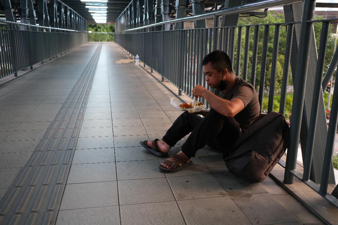 虽然他曾去餐馆面试时,遇到同胞,对方见他因视力问题而不被录用,便好心让他暂住在宿舍里,不料因公司禁止外来人士住在员工宿舍,他不想连累同胞却又身无分文,想起在富都中心一带有团体和善心人士派免费的饭,于是,他来到富都落脚,晚上睡在人行天桥上,白天则四处去领取免费的早餐、午餐和晚餐。
