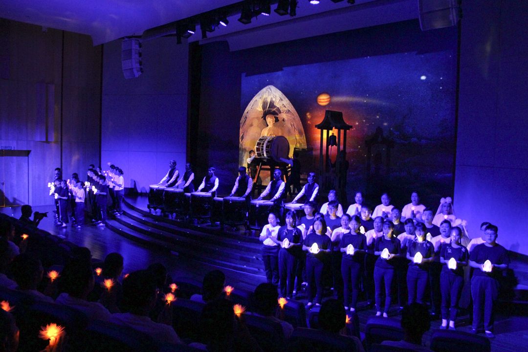 “大时代需明大是非,大劫难需养大慈悲……”音乐响起,全体演绎人员依序上台向观众们致谢,热烈的掌声让台上的参与人员谢幕三回。之后在祈祷声中及闪闪烛光下,大家把法会的功德回向给证严上人,并发愿要入法除习气,回归自然本性。