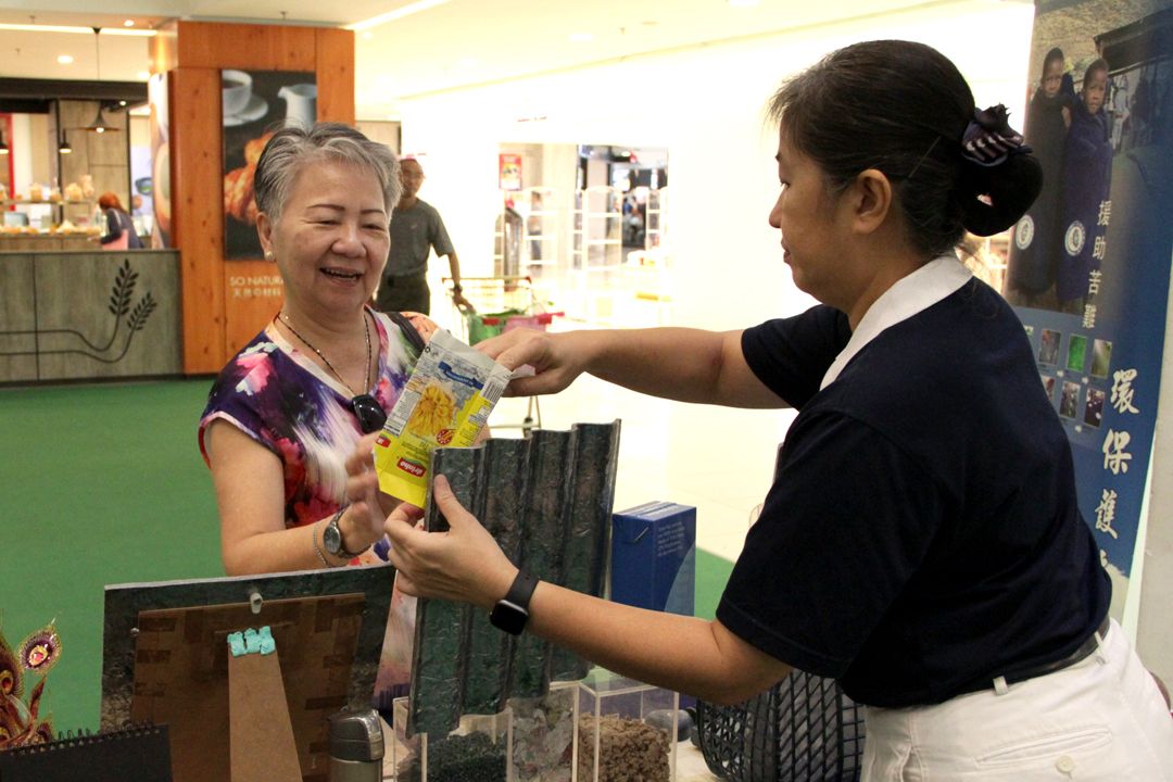 来自柔佛州昔加末,七十八岁高龄的卢美莉是慈济会员,她因为跌伤脚而必须坐在轮椅上参观环保展。她说:“你们做了很精彩的宣导。塑料使用不当的话,弊多于利,它会危害人体的健康,若是把垃圾到处乱丢就会影响生态。买食物时我都会自备容器,我们要疼惜大自然环境,不用农药或化学肥料伤害土地。”环保不分年龄,婆婆也把环保落实在生活中。